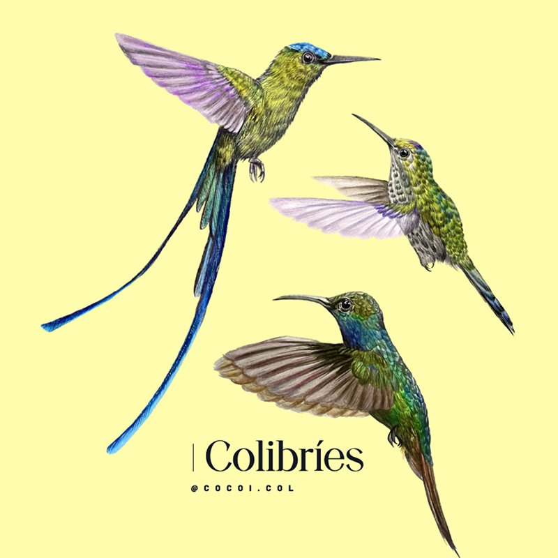 Pequeños en tamaño, pero inmensos en belleza. El frentiazul (Amazilia cyanifrons), el cola de raqueta (Ocreatus underwoodii) y el silfo coliverde (Aglaiocercus kingii) son los protagonistas de nuestra colección Colibríes. Este homenaje celebra a estas diminutas aves que, mientras se alimentan del néctar de las flores, desempeñan un papel crucial en la polinización de numerosas plantas.