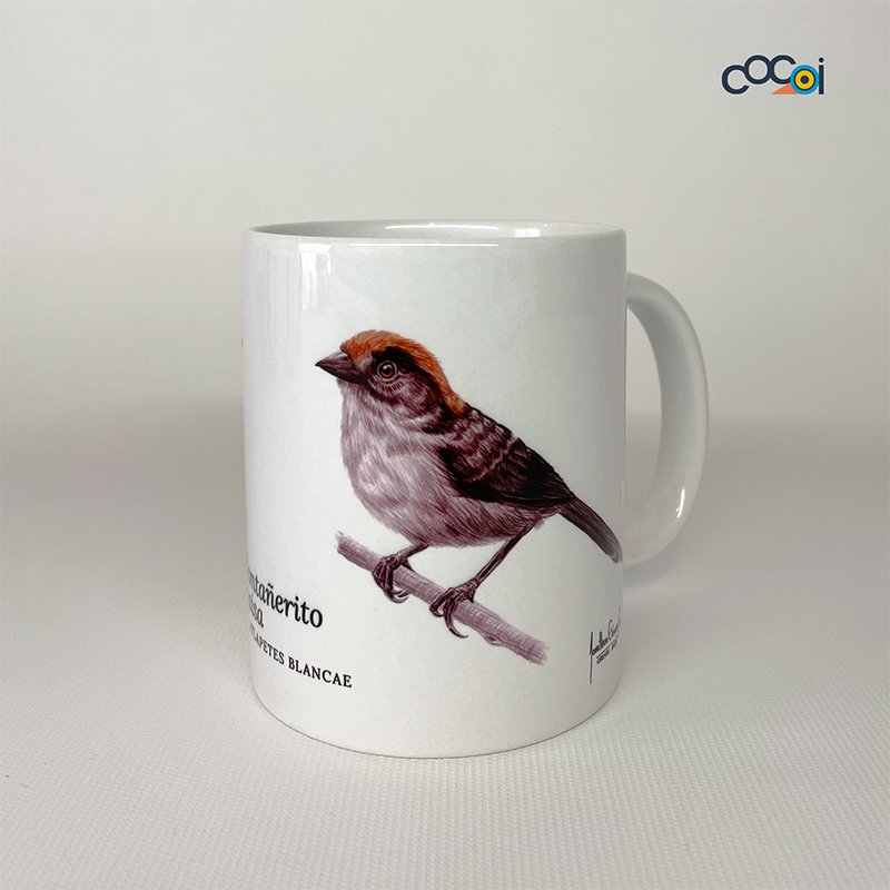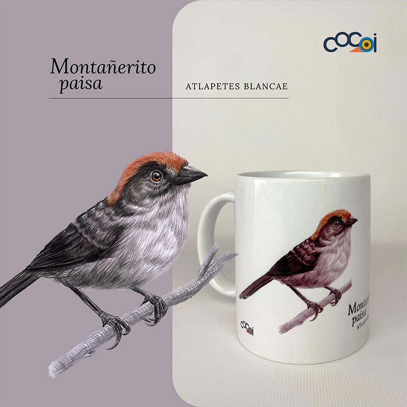 Atlapetes blancae es el nombre científico de esta ave que se encuentra en peligro crítico de extinción. Esta taza en cerámica busca enaltecer su belleza y hacer un llamado al cuidado de su ecosistema.